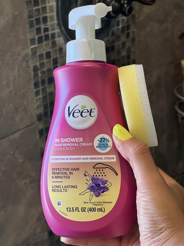 . Rated 4 out of 5 on MakeupAlley. Cons of Veet In-Shower Hair Removal. After following the instructions I put removal cream on my arms for less than 5 minutes.